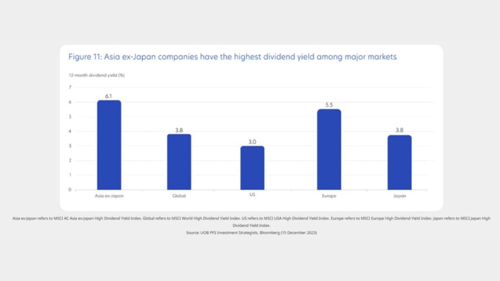 Justin Khoo, Senior Market Analyst APAC, VT Markets said that in 2024, bonds and other fixed-income assets will become less appealing as interest rates are predicted to decline over fixed-income bonds. Understanding the dividend stocks is effortless and manageable. Dividends are more noticeable when bonds have lower yields. These yields from premium dividend stocks in Asia often outpace those seen in Western markets. It sounds interesting to think of receiving a dividend that is consistently higher than the worldwide average. With a yield of almost 6.1%, the MSCI Asia ex-Japan High Dividend Yield Index offers a substantially higher yield than the 3.8% offered by the MSCI World High Dividend Yield Index.