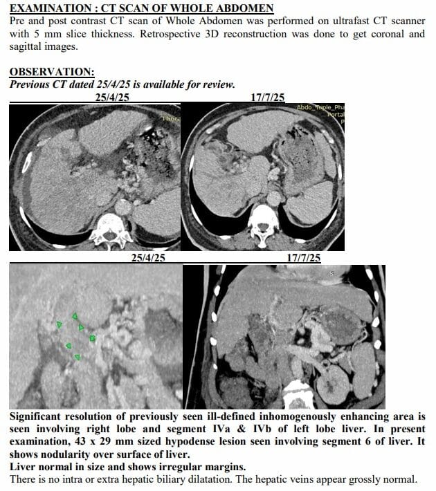 Yet just three months later, on another afternoon in July, the same family stared at a different scan. The tumours had shrunk to one patch. Blood was flowing again. The swelling was gone. Even the alarming tumour marker that had shot up to 1,000 ng/mL had fallen to 10, back in the safe zone. For a man who had been fading fast, it was a turnaround no one in the room dared to predict.