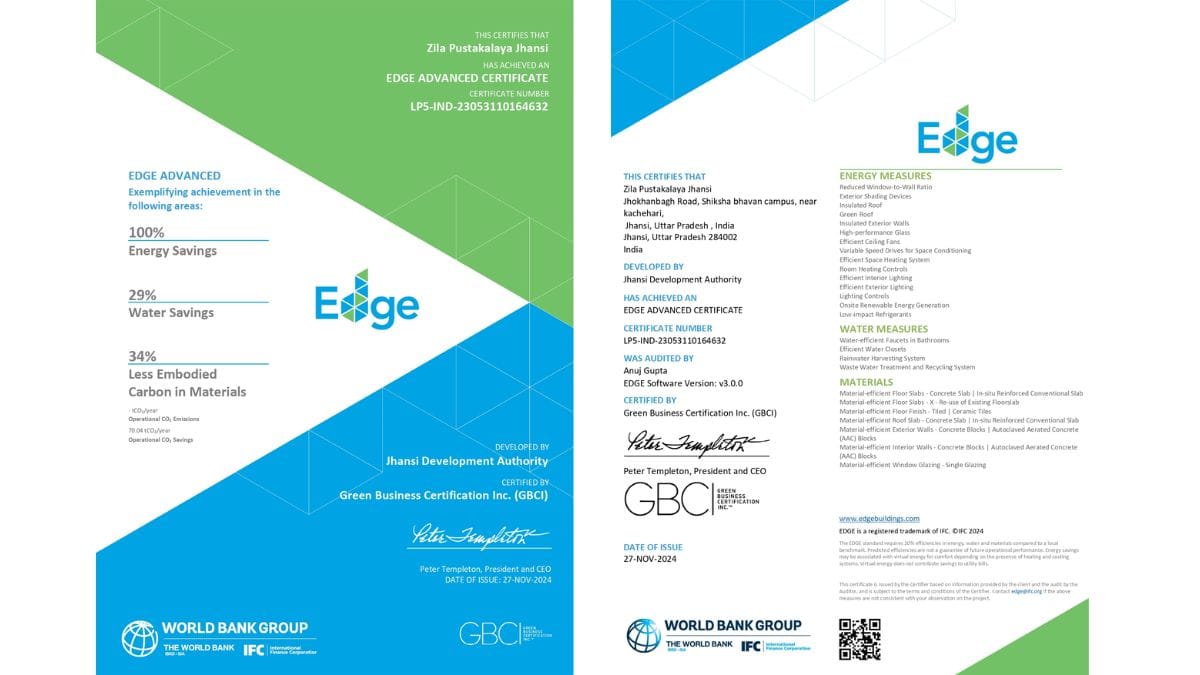 Gurugram (Haryana) [India], November 29: The Jhansi Library project, spanning 12,000 square feet and commissioned by the Jhansi Development Authority (JDA), with support from Jhansi Smart City, has achieved EDGE certification. This project was executed by BOOTES, India’s pioneering Net-Zero Company, within an impressive timeframe of 90 days. EDGE, an initiative of the International Finance Corporation (IFC), a member of the World Bank Group, represents a global standard awarded to developers and builders who implement cost-effective strategies aimed at minimizing energy consumption, water usage, and embodied carbon in construction materials. The strategies incorporated into the project design are subject to verification by an EDGE Auditor and certification by the Green Business Certification Inc. (GBCI), which administers EDGE certification in numerous countries globally.