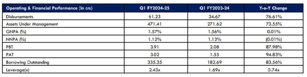 Business Numbers: AUM increased 73.55 % y-o-y to Rs. 471.41 crs. The Company disbursed Rs. 61.23 crs in the quarter under review.